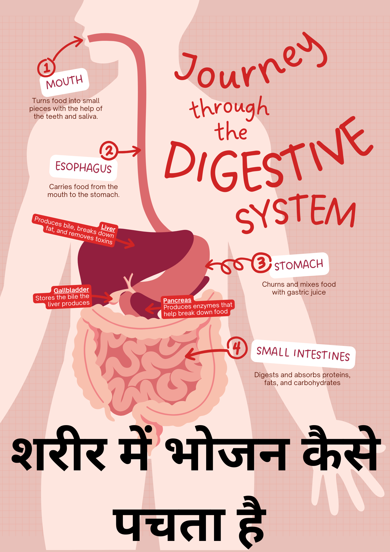 भोजन को पचाने की प्रक्रिया आपके शारीर के अंतर्गत कुछ विशेष अंगों और प्रक्रियाओं के माध्यम से होती है। यहां इस प्रक्रिया का संक्षेप में वर्णन है: